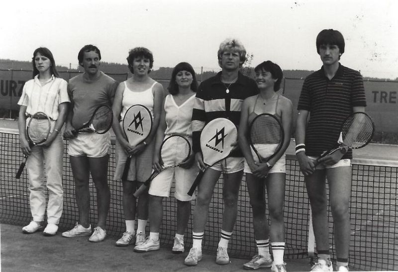 Tennis Saison 1983 19. Juli 1983 Vereinsmeisterschaften v.l.n.r: Anne Epacher, Josef Götz, Marianne Tirpak, Betha Gösele, Otto Ebert, Gerlinde Seckler, Hans-Peter Rup