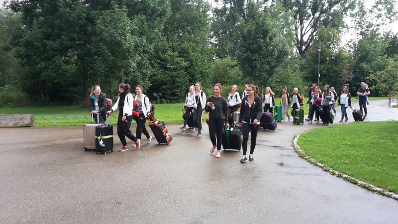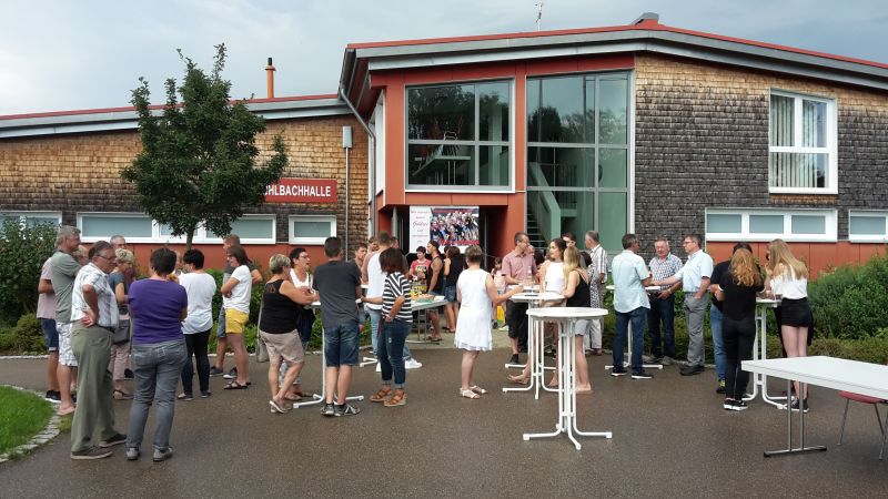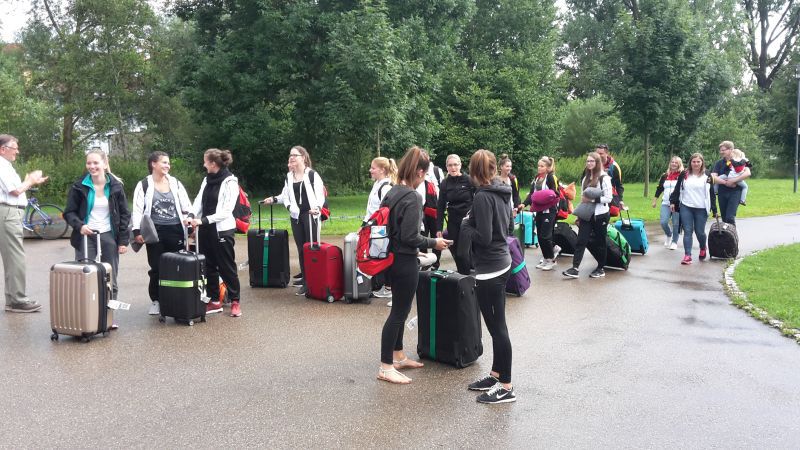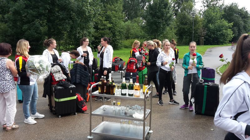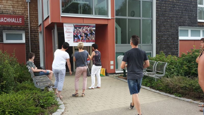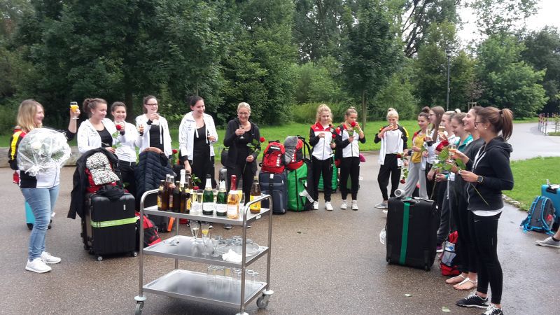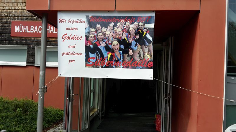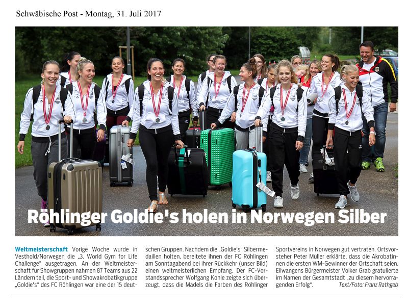 Ellwangen-Röhlingen sj Großer Bahnhof in Röhlingen für die frischgebackenen, deutschen Vizeweltmeister bei der Gym for Life Challenge in Norwegen: „Wir begrüßen unsere Goldies und gratulieren zur Silbermedaille“ hat es am späten Sonntagnachmittag auf einem großen Plakat am Eingang der Mühlbachhalle geheißen, als die 21 Röhlinger Mädchen und Frauen, davon zwei Betreuer, von dieser Weltmeisterschaft der Gymnastik zurückkehrten. Mit einem kleinen Empfang auf dem Vorplatz der Halle beglückwünschten gut und gern 50 Eltern, Freunde und Vertreter des FC Röhlingen, der Ortschaft und der Stadt das Team. Und die Mannschaft gab eine Showeinlage bei der Ankunft. Die Goldies des FC Röhlingen traten in der Kategorie „Small group dance“ an. In dieser Kategorie konkurrierten 47 Gruppen.