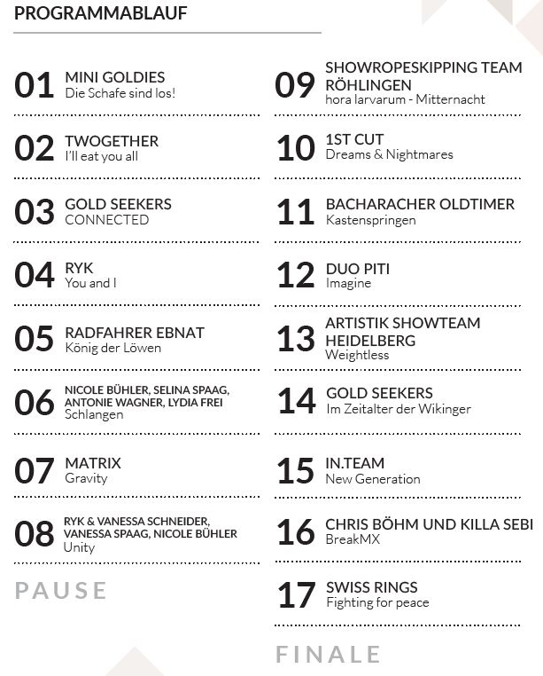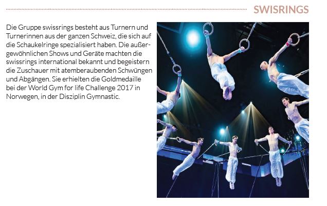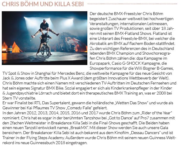 Am Gelingen der Gala hatten auch BMX-Freestyler Chris Böhm und der zweifache Breakdance-Weltmeister Killa Sebi maßgeblichen Anteil mit ihrem einzigartigen Tanzstil „BreakMX.“ Auf Schaukelringe spezialisiert sind die Swissrings. Sie reisten mit viel Equipment aus der Schweiz an und faszinierten zum krönenden Abschluss mit kühnen Schwüngen bis zur Hallendecke und sagenhaften Abgängen.