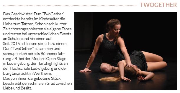 In scheinbar knochenloser artistischer Anmut tanzten die „Schlangen“ des FC Röhlingen, Nicole Bühler, Selina Spaag, Antonie Wagner und Lydia Frei. Mit graziöser Leichtigkeit beeindruckten Vanessa Schneider, Vanessa Spaag und Nicole Bühler bei „Unity.“ Ebenso leichtfüßig meisterten diese drei die Hauptlast der Organisation der Gala. Begleitet wurden sie von Sänger Ryk, dessen Soulstimme auch bei der Ballade „You and I“ unter die Haut ging.