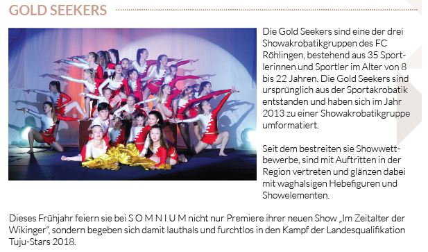 Die diesjährige Gala steht unter dem Titel „Somnium“ – nicht zuletzt wegen dem Herzensprojekt der Showakrobaten des FC Röhlingen, welches sie mit ihrer Sportgala vor vier Jahren verwirklicht haben. Seit 2015 begeistert der FC Röhlingen jedes Jahr im Frühling hunderte von Menschen.