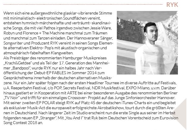 Einen kleinen Vorgeschmack gab es bereits beim Vorentscheid zum diesjährigen Eurovision Song Contest. Ryk nennt sich der 28-jährige Musiker aus Hannover, welcher sich mit seiner traumhaften, glasklaren Stimme auf Platz 3 sang und auch das Ellwanger Publikum mit Live-Gesang am Klavier verzaubern wird. Neben regionalen und überregionalen Showgruppen, wird es auch in diesem Jahr wieder international, mit Besuch aus der Schweiz.