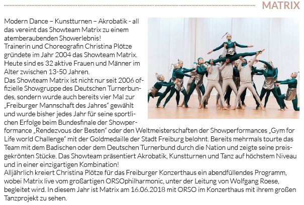 Die Schwestern Christine und Johanna Lang brachten als Duo „Twogether“ graziös getanzte Gefühle auf die Bühne. Zur Musik des Musicals „König der Löwen“ zeigten die Radfahrer des SV Ebnat Körperbeherrschung in Perfektion mit Kunst- und Hochrad: grandios. Mit Modern Dance, Kunstturnen und Akrobatik der Spitzenklasse überwand das Showteam Matrix mit „Gravity“ die Schwerkraft. Die Gäste aus Freiburg sind die offizielle Showgruppe des Deutschen Turnerbundes.