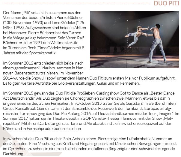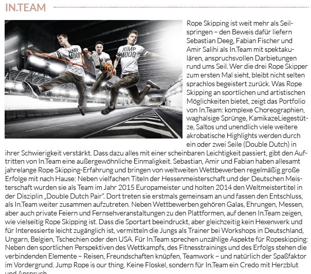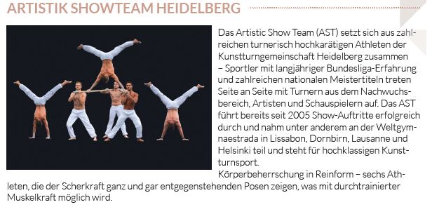 Eine Augenweide war das Tanz- und Akrobatik-Duo Piti aus Hannover, Pierre Büchner und Timo Gödeke. Fantastische Künste am Seil präsentierten die drei „In.Team“-Rope Skipper Sebastian Deeg, Fabian Fischer und Amir Salihi. Das maskuline Sextett des Artistic Showteams Heidelberg zündete mit „Weightless“ ein Feuerwerk kraftvoller Eleganz und durchtrainierter Körperbeherrschung.