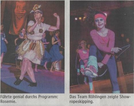 22 Mini Goldies wirbelten als frühlingsfrische „Pionites Leucogaster“, als Rostkappenpapageien, über die Bühne der ausverkauften Rundsporthalle. Für Gesangseinlagen sorgte die „Stib Visite“ der Kölner Musiker Titus Schlüter und Berend Ibbeken. Die Röhlinger Rope Skipper machten mit „Back to the 80’s“ Furore: sieht easy aus und ist höllisch schwer. Waghalsiges mit doppelten Seilen präsentierten wie im vergangenen Jahr die drei „In.Team“-Rope Skipper Sebastian Deeg, Fabian Fischer und Amir Salihi.