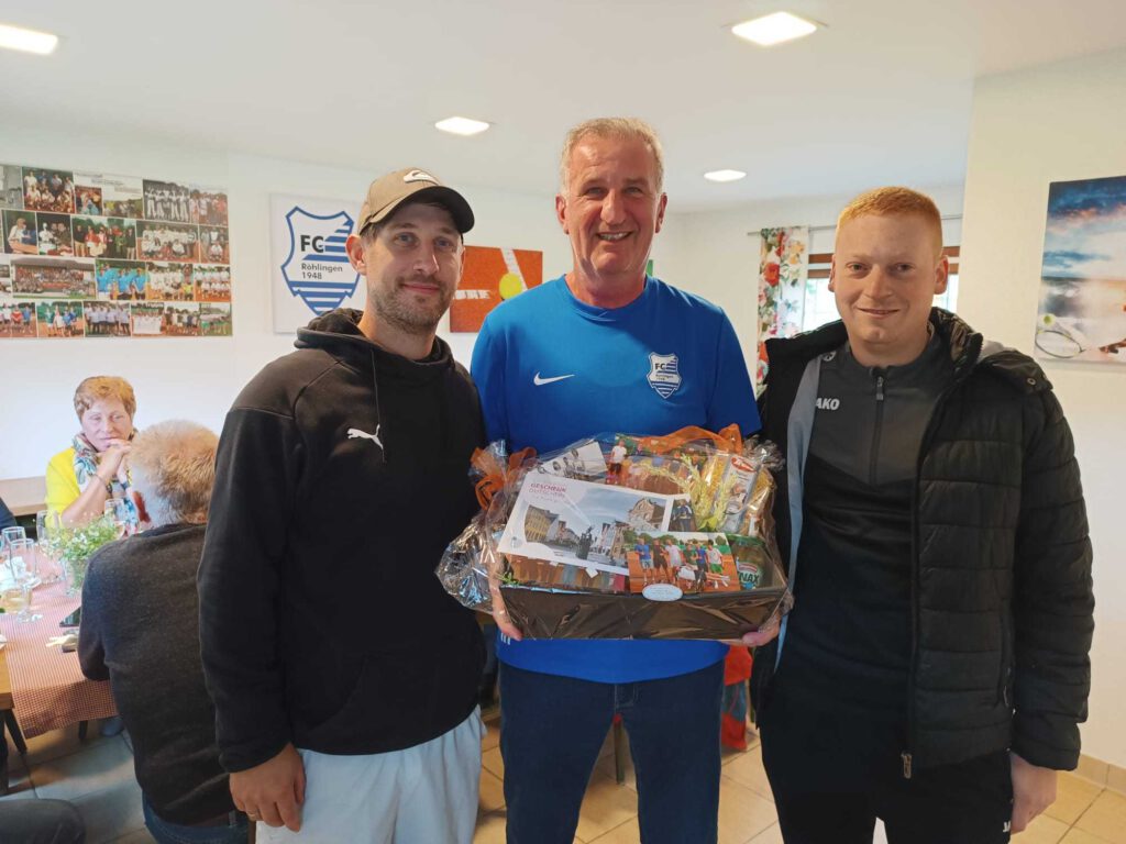 Geschenkkorb-Übergabe von Alex Vaas (links) und Steven Saur (rechts) an Hans-Peter Rup (mitte) zum Abschied aus der Abteilungsleitung.