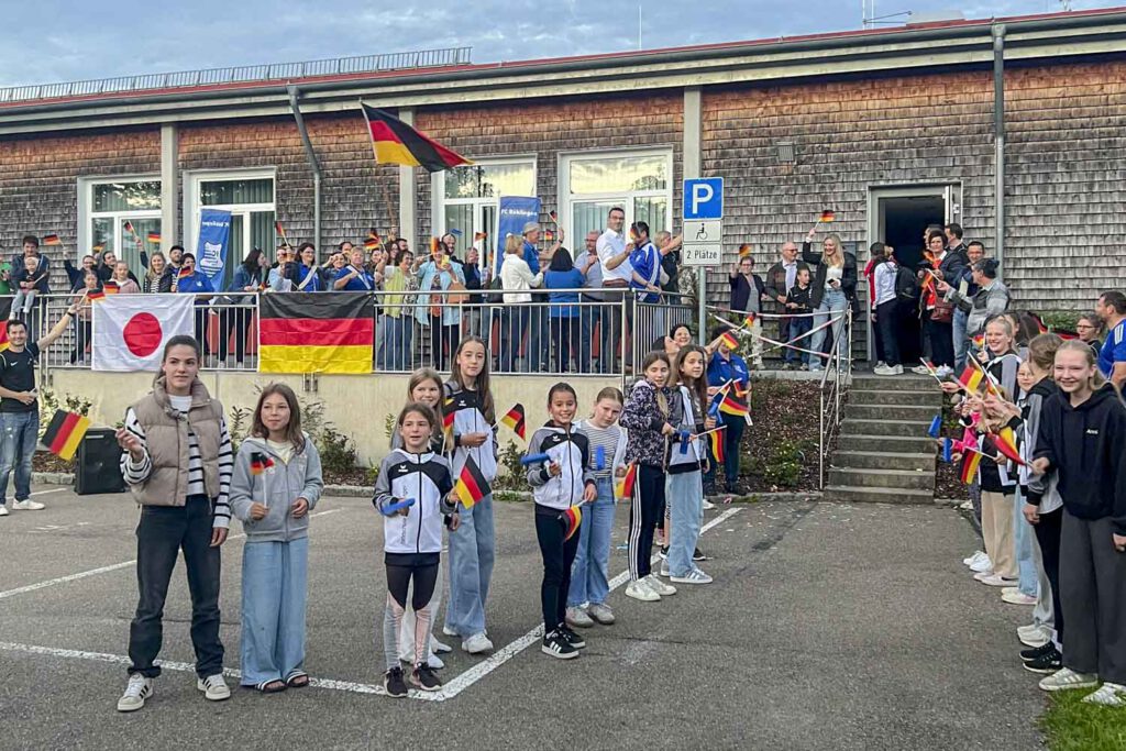 Auf der Terrasse der Mühlbachhalle wurden sie herzlich von Familien, Fans, Vereinsvertretern, Ortsvorsteher Walter Schlotter und Herrn Oberbürgermeister Michael Dambacher von der Stadt Ellwangen empfangen.