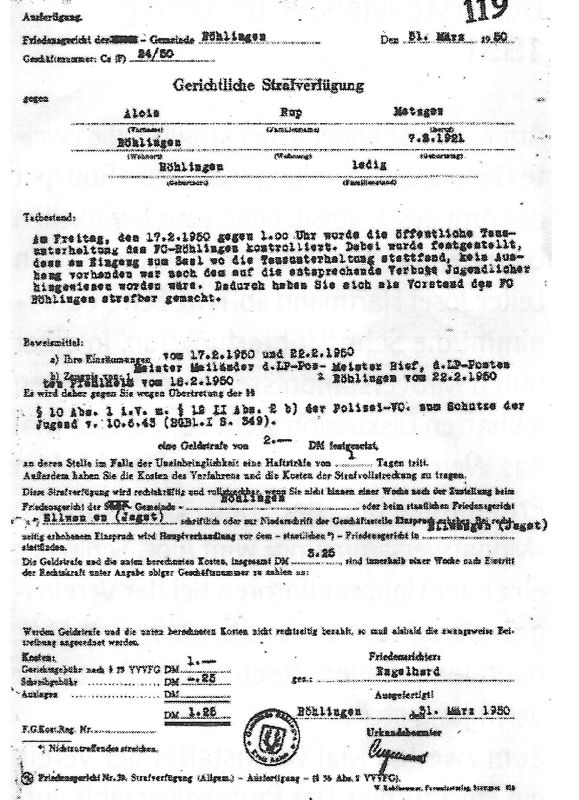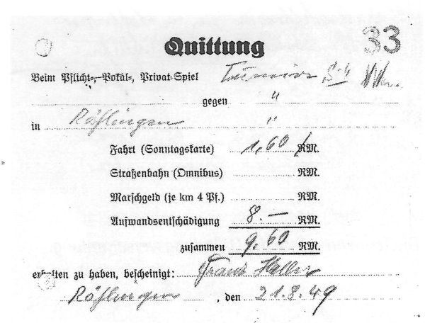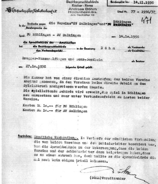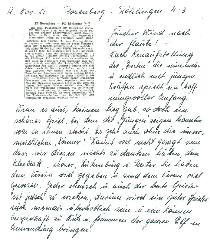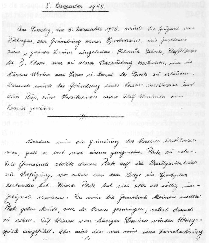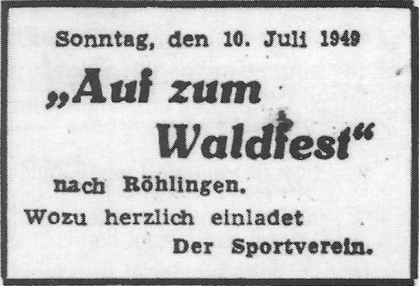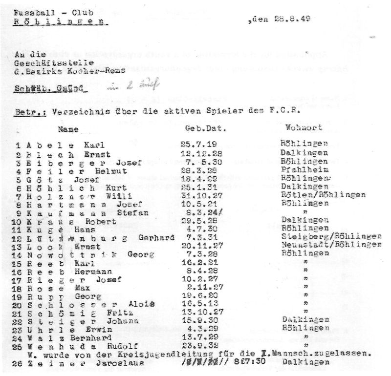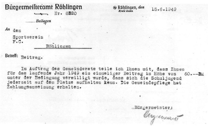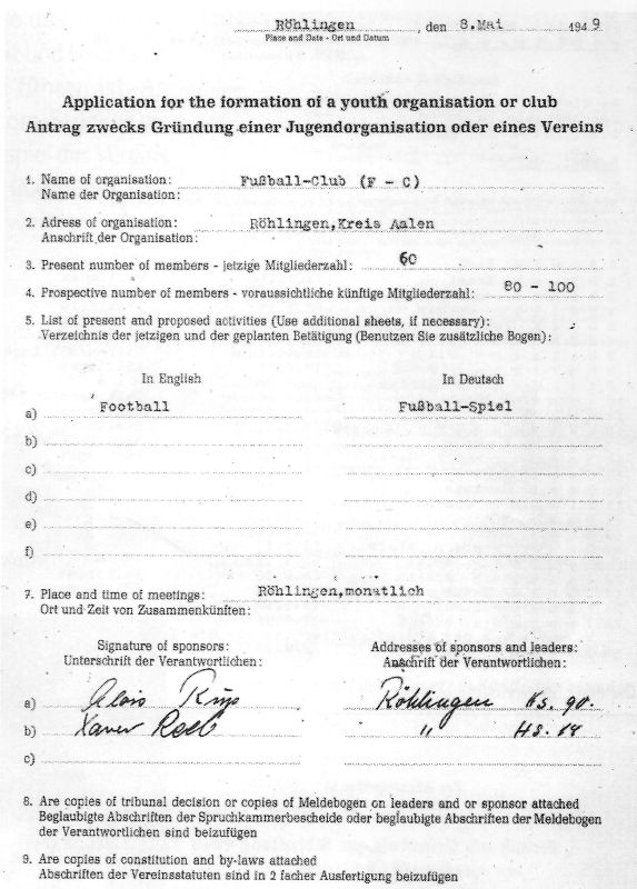 Anläßlich zur Gründung eines Sport-Vereins in Röhlingen und seinen Teil-Gemeinden, ersuchen wir die hiesige Ortsverwaltung um Genehmigung zu einer Gründungs-Versammlung. Dieselbe soll am Sonntag, den 05. Dezember 1948 um 14.00 Uhr im Gasthaus „grüner Baum“ stattfinden. Um alsbaldige Rückäußerung würde gebeten.