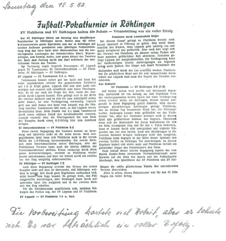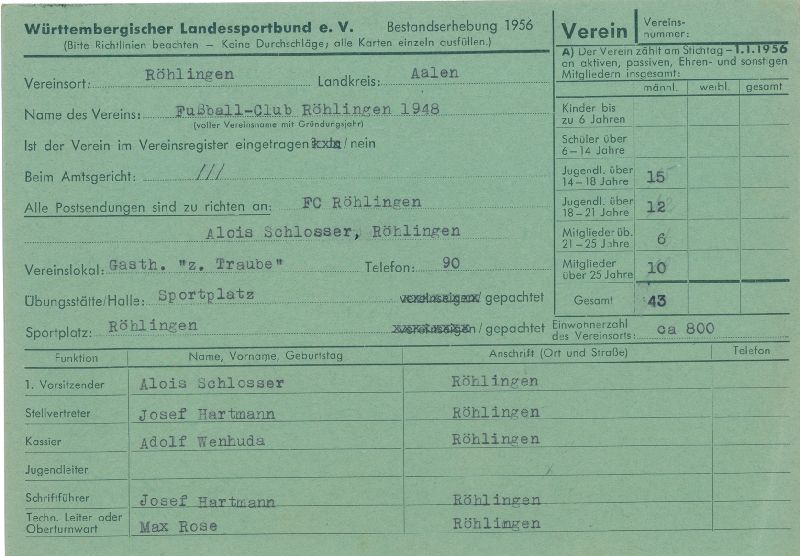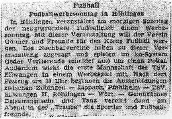 Nachdem aber dieser Antrag beim Bürgermeisteramt nicht zum Erfolg führte, da die angebotene Krautgartenheide nicht für das Fußballspielen geeignet war, kam diese erste Initiative vorerst wieder zum Erliegen. Doch die Antragsteller ließen sich nicht so schnell entmutigen, sondern wandten sich an die Röhlinger Spieler, die bereits im Sportverein Pfahlheim aktiv mitwirkten und baten diese um Unterstützung. Insbesondere waren es dann auch Alois Schlosser, Karl Reeb, Karl Abele und Josef Hartmann, die sich für die Gründung eines Fussballvereins in Röhlingen einsetzten.leo.