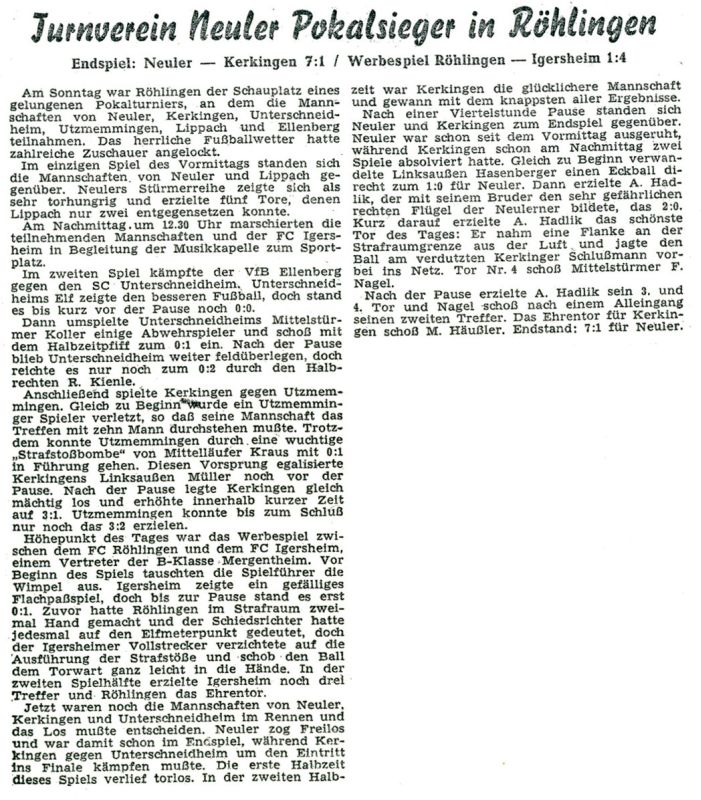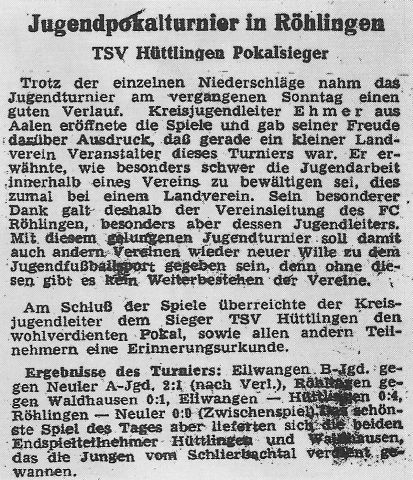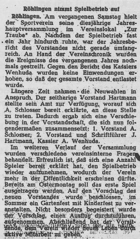 Als 2. Vorsitzender rückt Georg Gösele nach, und Jakob Epacher wird Jugendleiter. Ansonsten bleibt die Zusammensetzung des Ausschusses unverändert. Beim Pokaltumier, an dem sich sechs Mannschaften beteiligen, wird der TV Neuler Pokalsieger. Ein Werbespiel zwischen Röhlingen und dem FC Igersheim geht mit 4:1 für den Gastgeber verloren.