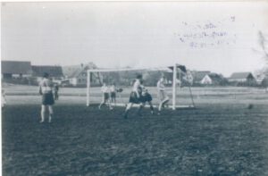In Röhlingen traf man sich auf der Krautgartenheide, einer Schafsweide, die dem Verein von der Gemeinde zur Verfügung gestellt wurde. Wenn sie auch recht holprig war, man war dennoch mehr als froh, wenigstens eine Fläche bekommen zu haben. Ausgediente alte Arbeitsschuhe, die von jedem selbst etwas zurecht gerichtet wurden, dienten anfangs als Kickstiefel. Geld um Fussballschuhe zu kaufen war kaum vorhanden, reichte es doch kaum jedem einzelnen, sich seinen Dreß, schon damals in den Farben blau-weiss, zu erwerben.