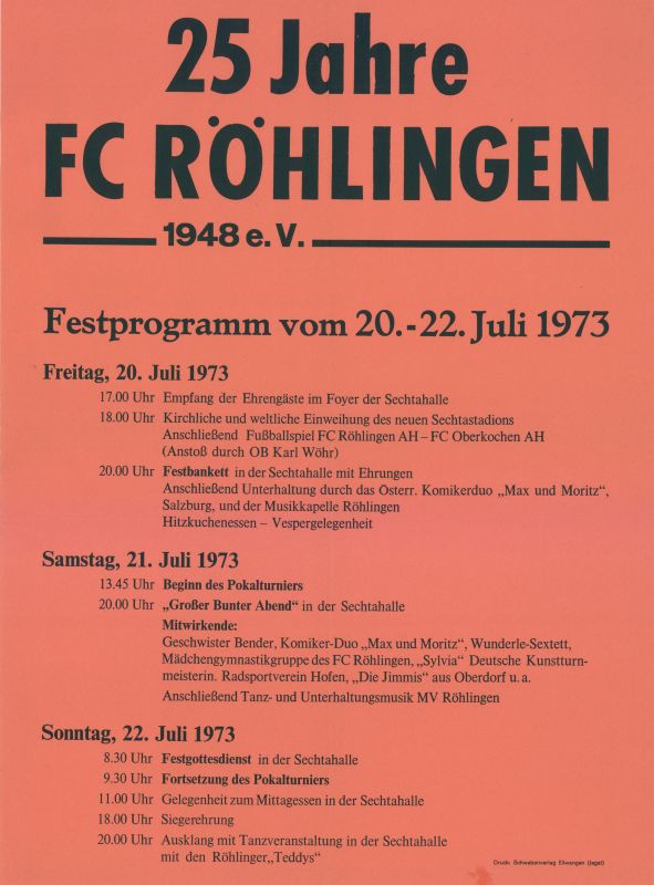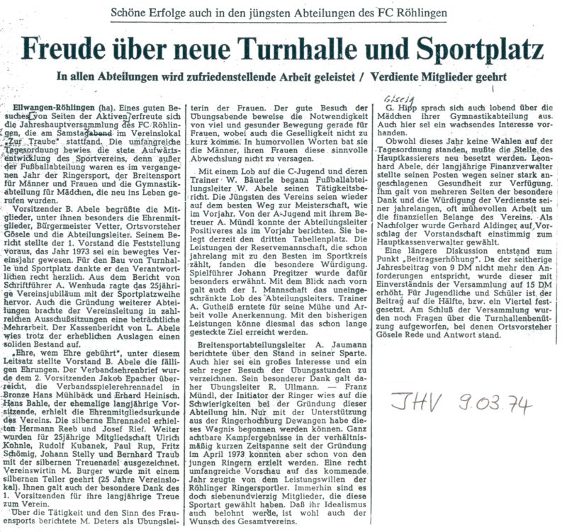 Zum 1.1.1972 wird die Gemeinde Röhlingen nach Ellwangen eingemeindet. Georg Gösele wird Ortsvorsteher und versichert, den Bau des Sportplatzes sowie der Turnhalle weiter voran zu treiben. Endlich wird auch mit dem Bau, dieser noch von der Gemeinde Röhlingen geplanten Halle begonnen. Auch das 2. Scheunenfest wird trotz Regen zu einem vollen Erfolg, was auch dringend notwendig ist, nachdem man trotz Turnhallenbau der Gemeinde an dem Vorhaben eines Vereinsheimbaus am Sportplatz (Kosten ca. 90.000.- DM) festhält.