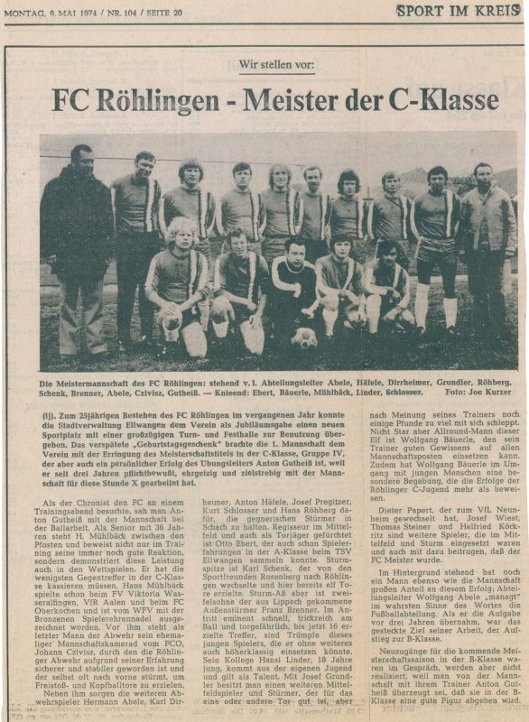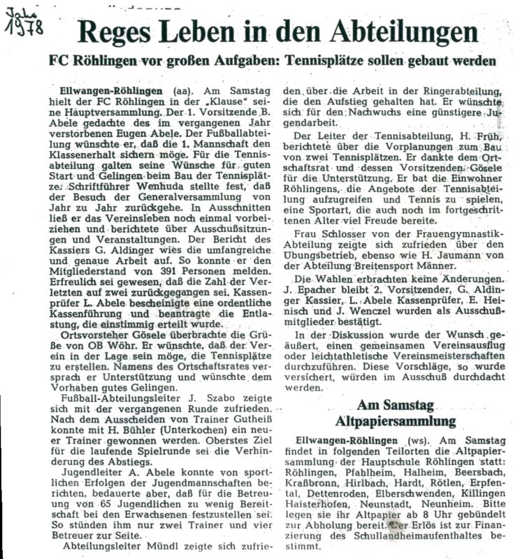 Wolfgang Abele wird zum Abteilungsleiter Fussball gewählt und so machen die Aktiven in diesem Jahr auch zum ersten Mal einen Ausflug nach Koloman. Die aktiven Mannschaften werden etwas durch auswärtige Spieler verstärkt. Für ein monatliches Gehalt von 200.- DM wird ein neuer Trainer angestellt. Die Errichtung einer Flutlichtanlage am Sportplatz wird in Erwartung, dass der neue Platz bald fertiggestellt ist, zurückgestellt.