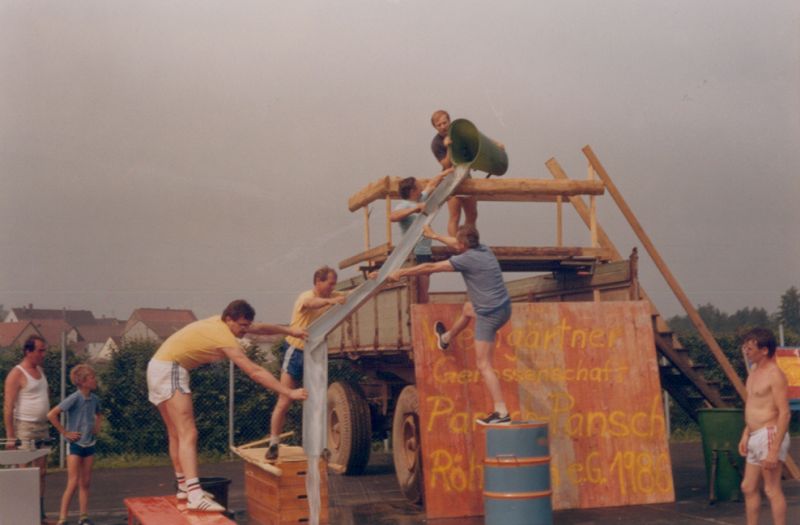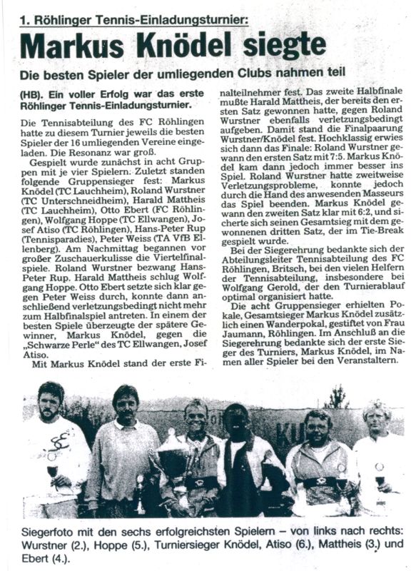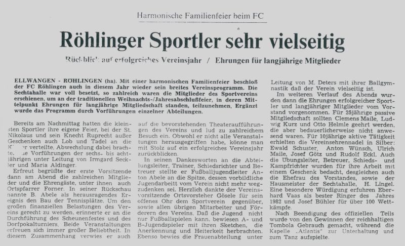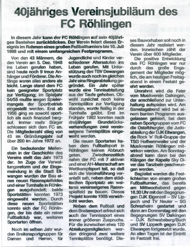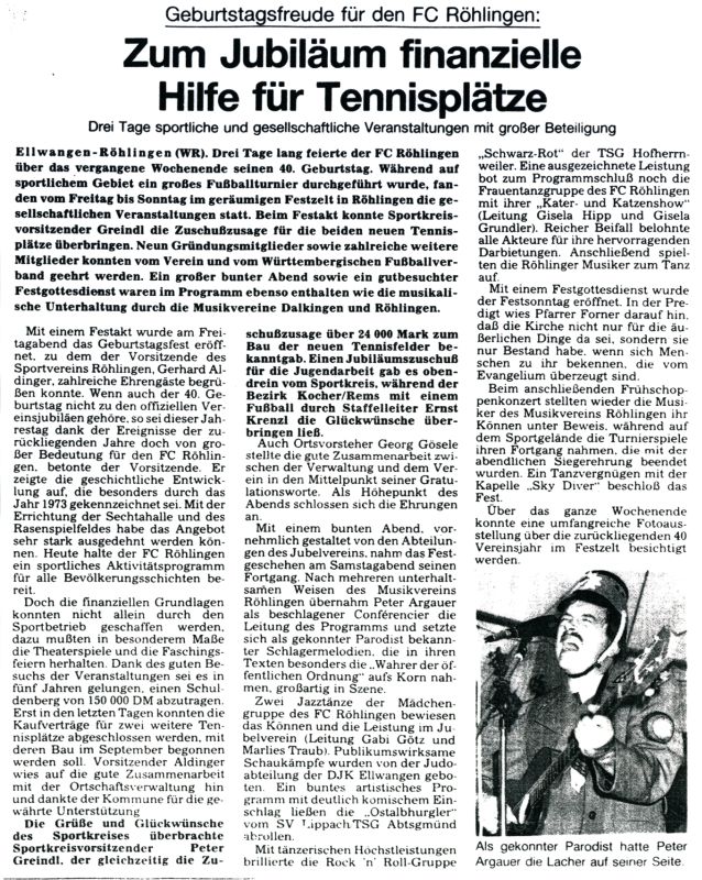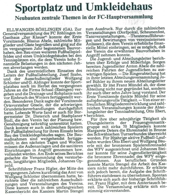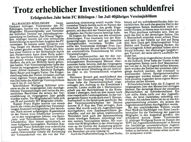 Auch der Fussball kann nicht damit rechnen, dass der Wunsch nach einem Hartplatz binnen der nächsten 10 Jahre Realität wird. Das erste Dorfpokalturnier über Pfingsten übertrifft alle Erwartungen und wird bei herrlichem Wetter zu einem großen Röhlinger Dorffest. Mit zwei Gruppen im Kinderturnen und dem Lauftreff geht man auch im Sport weitere neue Wege. Die Ringer steigen aus der Verbandsliga ab, werden aber in der Mannschaftswertung Vize-Bezirksmeister.