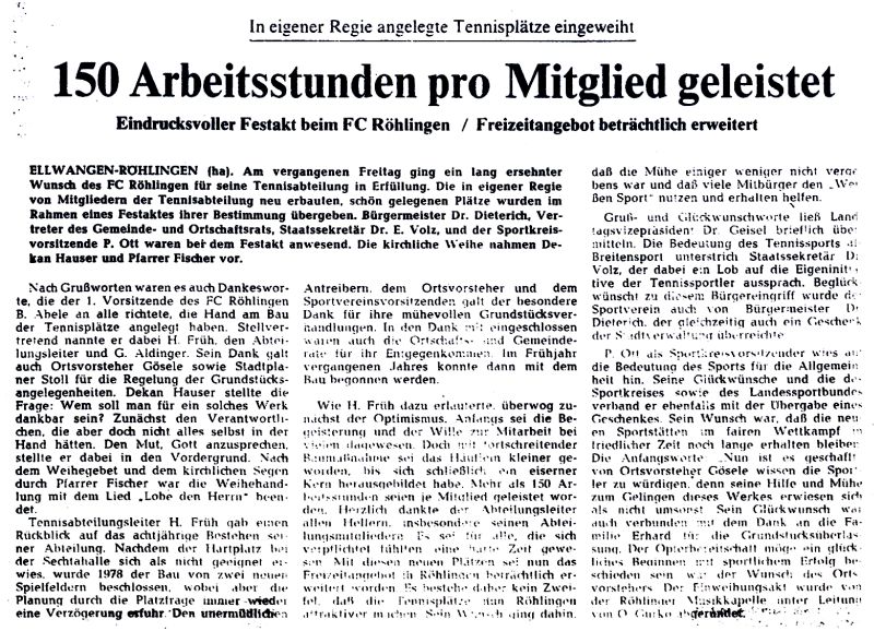 Der FC führt zum ersten Mal das Gaufrauentreffen des Turngau Ostwürttemberg durch. Aufgrund der hohen Teilnehmerzahl von 900 Frauen wird die Veranstaltung in der Ellwanger Rundsporthalle abgehalten. Mit dem Bau der zwei weiteren Tennisplätze wird im Juni begonnen. Schon 3 Monate später kann mit einem Tennis-Open-Turnier, zu dem die besten Spieler der umliegenden Vereine eingeladen werden, die Einweihung dieses über 110.000,– DM (ca. 55.000 €) teuren Projekts gefeiert werden.