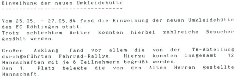Der Sportplatzbau wird, nachdem noch eine zusätzliche Entwässerungsleitung ausserplanmässig zu erstellen war, abgeschlossen. Finanziell ein hartes Jahr, mussten doch für Hütte und Sportplatz über 300.000 DM (ca. 150.000 €) investiert werden.