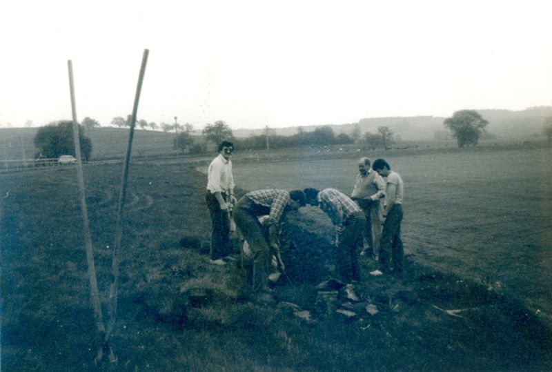 Aufgrund der Herstellungskosten lässt man den ursprünglichen Plan, einen Hartplatz zu bauen, fallen und entscheidet sich für einen Rasenplatz, mit dessen Bau noch im Herbst durch die Fa. Schaal begonnen wird. Auch mit dem Bau der Schutzhütte geht es ab Herbst schnell voran.