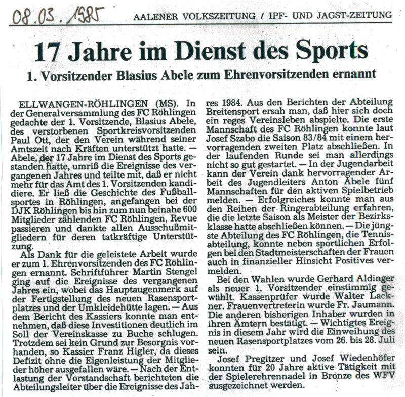 Nach 17 Jahren Tätigkeit als 1. Vorsitzender gibt Blasius Abele sein Amt an Gerhard Aldinger ab. Der Verein ernennt ihn zum Ehrenvorsitzenden.
