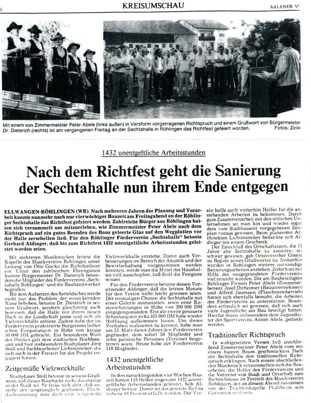 Für den Einbau einer Galerie im Rahmen der Sechtahallensanierung wird am 23. März der “Förderverein Sechtahalle” mit dem Vorsitzenden Gerhard Aldinger gegründet. Nach nur vierwöchiger Bauzeit kann bereits Richtfest gefeiert werden.