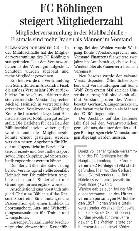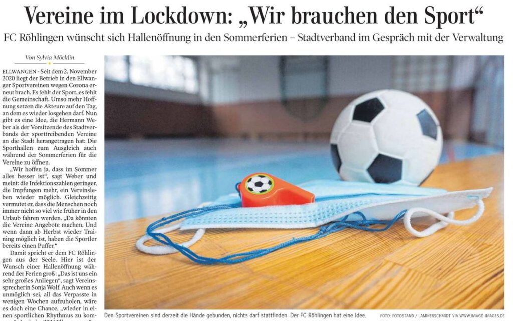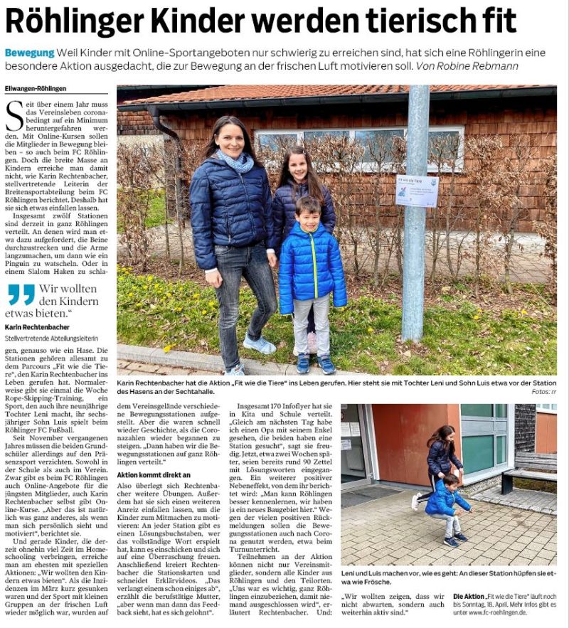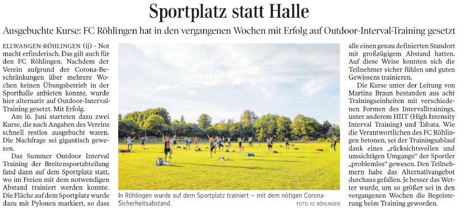 Ende Dezember 2020 und Anfang Januar 2021 setzte im Ellwanger Stadtteil Röhlingen die dort wohnhafte Fitness-Trainerin Dr. Martina Braun ihre Idee von Online-Fitnesstraining für einen guten Zweck unter dem Motto: „In Zeiten des Corona-Lockdowns – Spaß, Energie und Kraft haben! Sport treiben und Körper und Geist gesund halten! Gutes tun!” mit Unterstützung des FC Röhlingen 1948 e.V. um.
